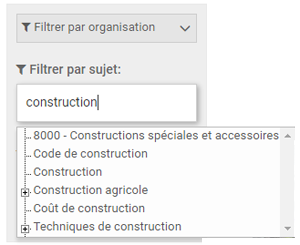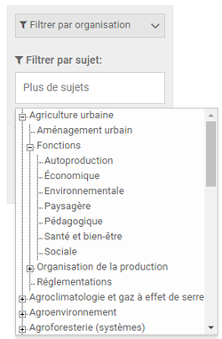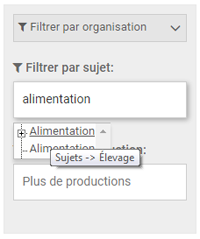 Attention! Les sujets sont présentés de façon hiérarchique. Si vous cherchez un sujet et qu’il apparaît deux fois dans les résultats, vérifiez l’endroit où il est placé en survolant la souris en survolant le mot avec la souris. Par exemple pour alimentation, le premier résultat Alimentation se trouve dans le sujet Élevage :