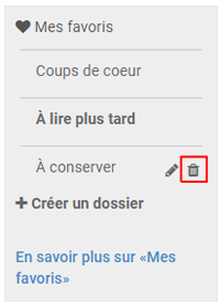 Pour retirer un contenu cliquez sur le cœur plein, le contenu sera directement retiré du dossier « Mes favoris » dans lequel il était classé. Il est possible de retirer un contenu à partir de la navigation ou à partir de la section « Mes favoris ».