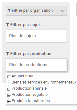 Il est possible d’utiliser ce filtre de façon très large (exemple : Production végétale) ou très précise en ciblant une production en particulier (exemple : carotte).