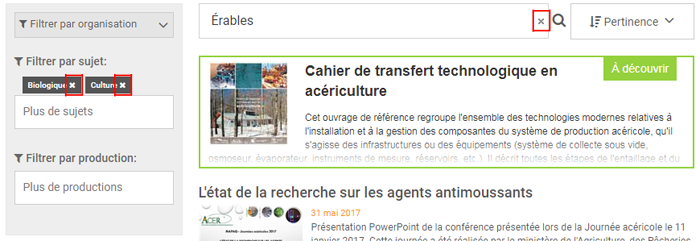 Si vous utilisez à la fois le filtre par sujet et le filtre par production, les résultats présentés répondront aux deux critères (ET). Par exemple, sur le site Petits fruits, si vous sélectionnez le sujet « Biologique » et la production « Canneberges », tous les contenus qui traitent à la fois de production biologique ET de canneberges s’afficheront.