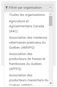 Ce filtre permet d’afficher les contenus diffusés par une des organisations listées. Celles-ci sont affichées dans l’ordre alphabétique. Vous pouvez donc choisir une organisation ou afficher les résultats pour « Toutes les organisations ».