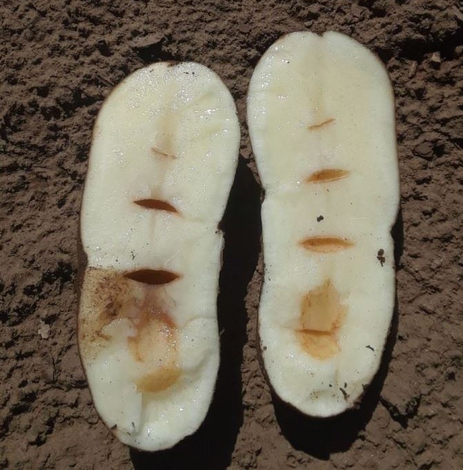 Le temps anormalement chaud et sec continue de mettre de la pression sur la culture. La sénescence, le dessèchement de la base de plants et/ou même du dépérissement graduel se poursuivent. Le tout demeure cependant variable selon le cultivar, la date de plantation, le fond du terrain (texture du sol), la rotation et la pratique ou non de l’irrigation. Cette dernière se poursuit partout en province où les systèmes sont disponibles et l’eau en quantité suffisante, ce qui n’est pas le cas pour tous les producteurs. Des collaborateurs rapportent que ces apports en eau ne donnent pas nécessairement les résultats escomptés. Des cultivars de maturité plus tardive ou semés plus tard présentent encore une belle apparence par endroits (ex. : 'Russet Burbank', 'Pomerelle', 'Caribou Russet', 'Campagna', 'CalWhite'), mais on commence à observer du jaunissement du bas de plants. Le remplissage des tubercules se poursuit, mais moins rapidement sous ces conditions. Les récoltes dans la primeur se déroulent à un rythme plutôt normal avec un rendement meilleur dans les régions plus au sud et une belle qualité en général, si ce n’est d’un peu de gale par endroits, le plus souvent en lien avec le cultivar. Quelques cas de cœur creux ont été rapportés dernièrement, pour de plus gros tubercules (voir la photo 1) et pour certains cultivars. Les opérations de défanage pour les récoltes visant l’entreposage à plus long terme devraient débuter au courant de la semaine prochaine dans les régions du sud de la province.