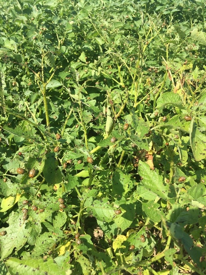 Le doryphore de la pomme de terre demeure sous contrôle à peu près partout. C'est principalement l'activité des adultes estivaux qui est rapportée. Localement, quelques interventions pourraient être nécessaires dans des champs à maturité plus tardive, le plus souvent en bordure seulement, afin de préserver le plus de feuillage sain possible avec le temps chaud et sec en cours (voir les photos 2 et 3).