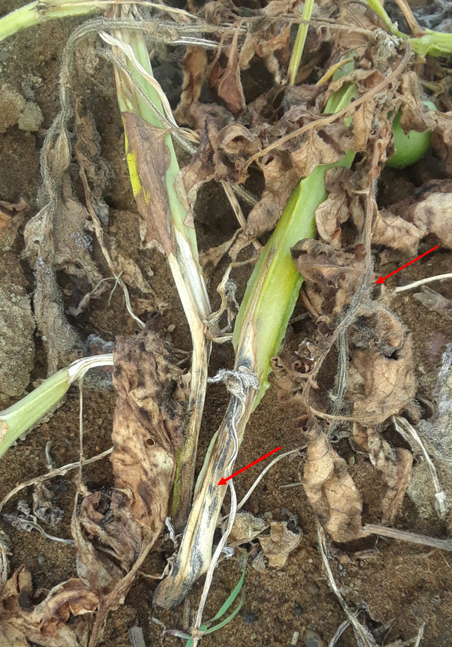 Le dépérissement ou la sénescence rapide de plants rend le dépistage de maladies, comme la dartrose (voir la photo 4) et le flétrissement verticillien, plus difficile à réaliser. Leur présence est rapportée à la hausse dans plusieurs champs de plusieurs régions, contribuant ainsi à accélérer le dépérissement.