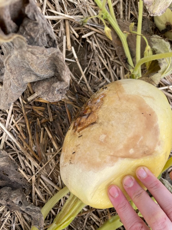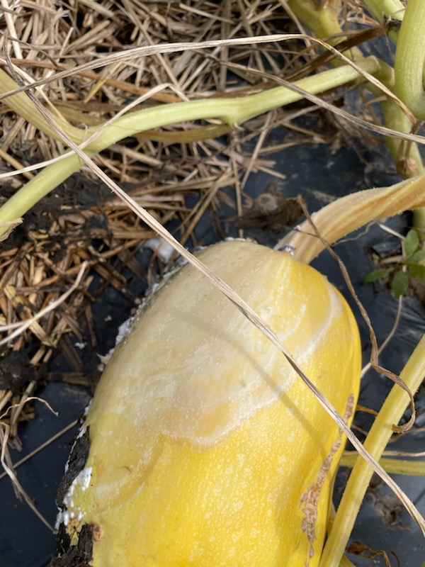 Depuis deux semaines, nos collaborateurs et collaboratrices ne nous signalent pas de nouvelle apparition massive de pourriture noire dans la courge Butternut. Par contre, on rapporte davantage de pourriture de fruits causée par le Phytophthora capsici dans des champs avec ou sans antécédents de la maladie. Les fortes pluies et la chaleur sont d'importants éléments déclencheurs du pathogène. On signale aussi, maintenant que les récoltes ont débuté, la présence de Fusarium sur les courges spaghetti, au niveau de la zone de contact du fruit avec le sol. Ces lésions sont généralement superficielles, mais il n'est pas conseillé d'entreposer les courges fortement touchées, car la pourriture pourrait pénétrer la chair si les conditions d'entreposage sont inadéquates.