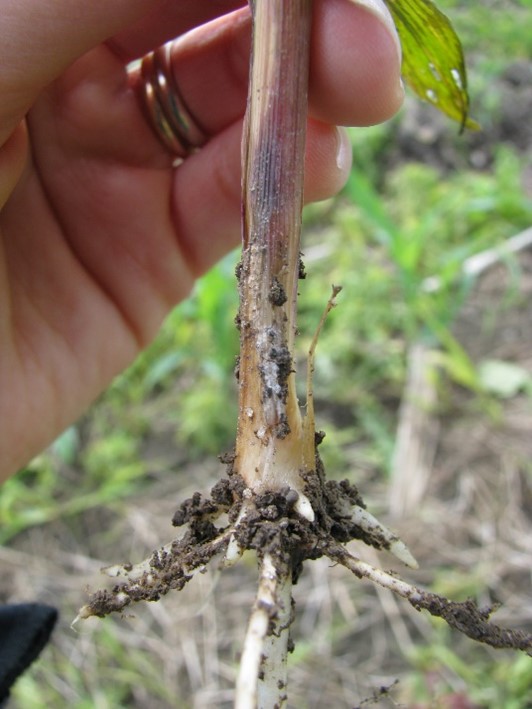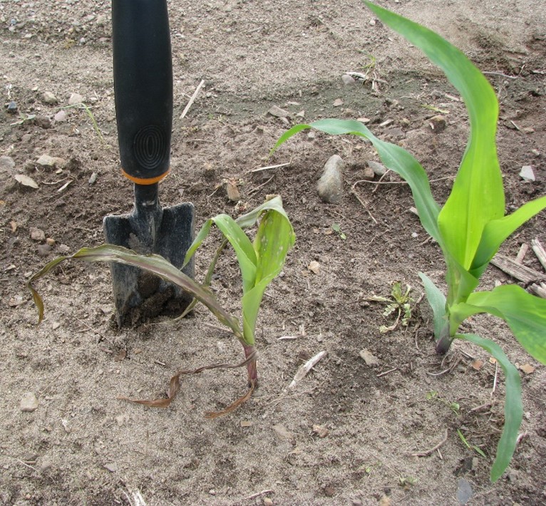 Pour plus d’information sur d’autres causes de verse du maïs, consultez le bulletin d'information Plants de maïs en forme de « cols d’oie » : causes possibles.