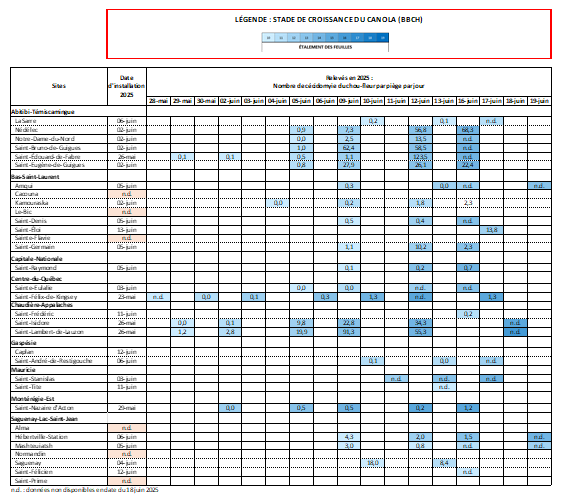 Les captures actuelles d’adultes de la cécidomyie du chou-fleur (CCF) pour les sites en canola de printemps suivis par le RAP Grandes cultures montrent que les populations sont généralement faibles. Toutefois, certains sites présentent des niveaux de captures moyennes à élevées, notamment en Abitibi-Témiscamingue (Nédélec, Saint-Bruno-de-Guigues et Saint-Édouard-de-Fabre) et en Chaudière-Appalaches (Saint-Isidore, Saint-Lambert-de-Lauzon). Les stades sensibles ne sont toutefois pas encore atteints, puisque les champs de canola dépistés sont entre le stade « levée » et le stade « six feuilles ». Les données de piégeage sont accessibles ICI.