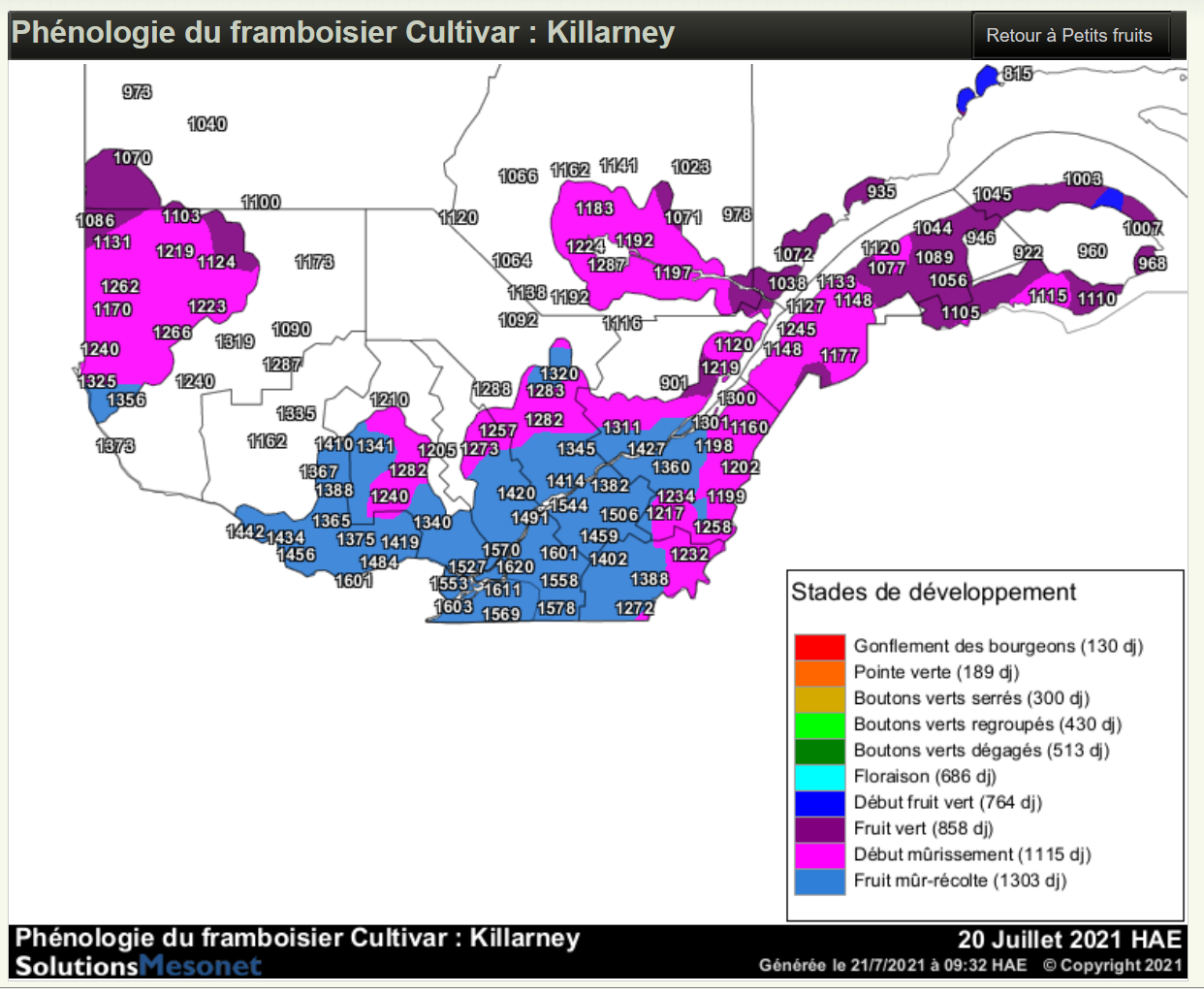 Avec la période des récoltes de framboises d'été qui bat son plein vient le dernier avertissement hebdomadaire de la saison 2021 pour le réseau Framboise. Toutefois, si des observations particulières nous étaient mentionnées, nous rédigerons un avertissement spécifique à cet effet. Nous profitons de l’occasion pour remercier l'ensemble des collaborateurs du réseau qui, tout au cours de la saison, rapportent leurs observations et fournissent de l'information utile pour une bonne gestion phytosanitaire.