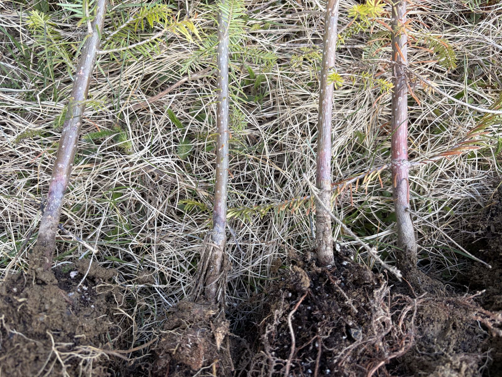 Image Agri-RéseauChancre (zone rougeâtre) causé par Phytophthora abietivora au collet de jeunes arbres (avril 2026)