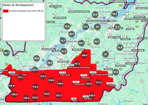 Les clubs agroenvironnementaux ont commencé le dépistage du puceron des pousses du sapin en Estrie. Le modèle prévisionnel prédit que l’éclosion des œufs devrait être terminée dans une grande partie de la Montérégie et de l’Estrie. Cependant, il faut utiliser les modèles avec prudence et il est important de valider par un dépistage sur le terrain. Le dépistage est réalisé dans les plantations à partir de trois ans avant la vente. Notez que l’éclosion des œufs n’est pas terminée en Chaudière-Appalaches.