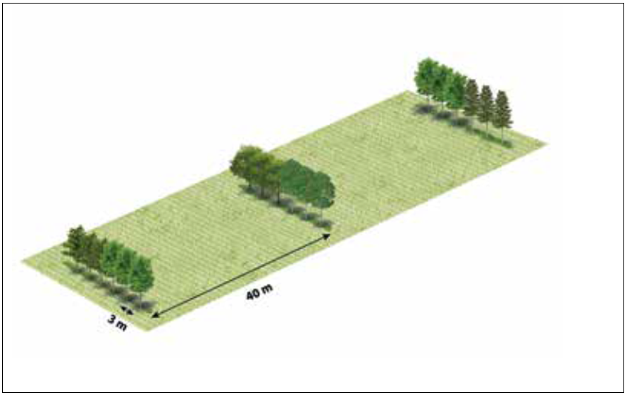 On peut prévoir récolter les arbres à croissance rapide tels que les peupliers au bout de 15 à 25 ans (DHP = 40 à 45 cm) et laisser les arbres à croissance plus lente en place. Une densité initiale de 50 arbres/ha (5 m x 40 m) pourrait être réduite à 25 arbres (10 m x 40 m) après la première récolte.