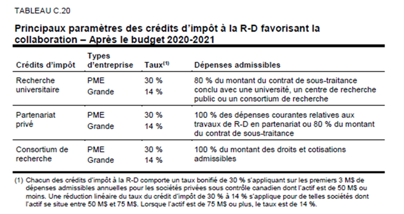 Dans le cadre du Budget 2020-2021, afin d’encourager davantage la collaboration entre les acteurs en innovation au Québec, le gouvernement annonce le retrait des seuils de dépenses admissibles applicables à ces trois crédits d’impôt à la R-D favorisant la collaboration.