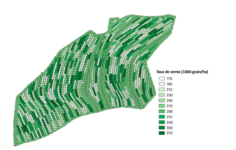 Comment faire varier les intrants à la ferme avec l’agriculture de précision? On fait varier le niveau d’intrant, fertilisant ou semences par exemple, à l’aide d’applicateurs ou semoirs à taux variable, reliés au GPS et activés par une carte de prescription. Puis on collecte les données de rendement à l’aide des capteurs de la moissonneuse-batteuse. Ces données sont toutes géoréférencées. Cette technique permet de transformer des champs entiers en parcelles d’essai.
