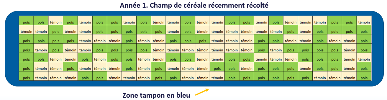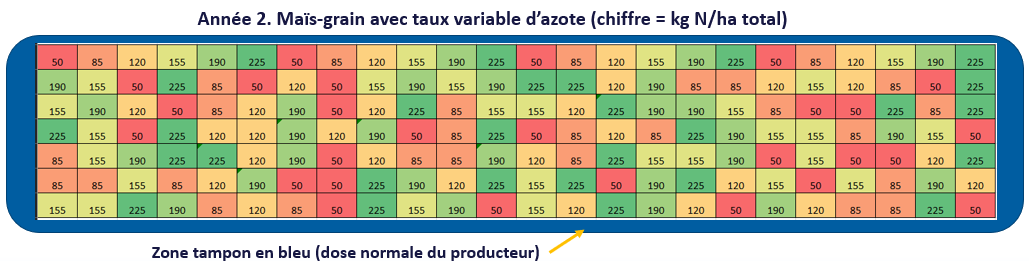 L’année suivante, le maïsv y serait semé avec un démarreur, et des doses variables d’azote seraient appliquées dans les parcelles établies l’année précédente. Dans cet exemple, chaque combinaison « culture de couverture/taux d’azote » serait répliquée 14 fois, pour un total de 168 parcellesvi. La superficie sous essais serait d’environ 23 ha, en considérant que chaque parcelle ferait 18 X 75 mètres. En ajoutant une bande tampon sur le pourtour (en bleu sur le schéma), le champ nécessaire serait d’environ 30 hectares.