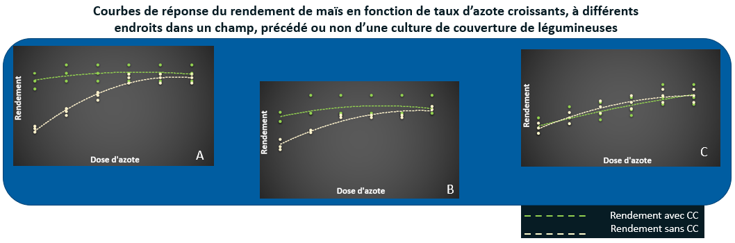 Dans une telle situation, le maïs des zones A et B, cultivé après une culture de couverture de pois et avec une faible dose d’azote minéralvii, donnerait autant de rendement que le maïs ne suivant pas une culture de couverture, mais cultivé avec une très forte dose d’azote minéral. Ce genre de scénario est très probable et a été observé dans de petites parcelles, autant à la fermeviii qu’en centre de recherche.