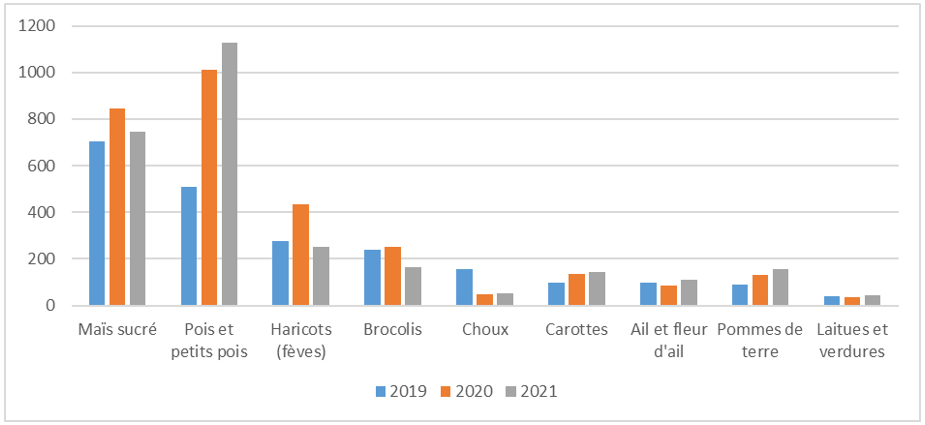 La production de légumes biologiques de plein champ au Québec a montré une croissance significative au cours de la dernière décennie. La superficie des terres dédiées aux légumes biologiques est passée d’environ 2 640 hectares en 2017 à plus de 3 990 hectares en 2022. Le nombre de fermes certifiées biologiques en production végétale opérant au Québec a également augmenté sur cette période : il est passé d'environ 1 280 fermes en 2019 à 1 477 fermes en 2023, dont 567 produisant des légumes de champs (selon Portail Bio). Les légumes biologiques cultivés au Québec comprennent principalement le maïs sucré, les pois, les haricots, les brocolis, les choux, les carottes, l’ail, les pommes de terre et les laitues (figure 1).
