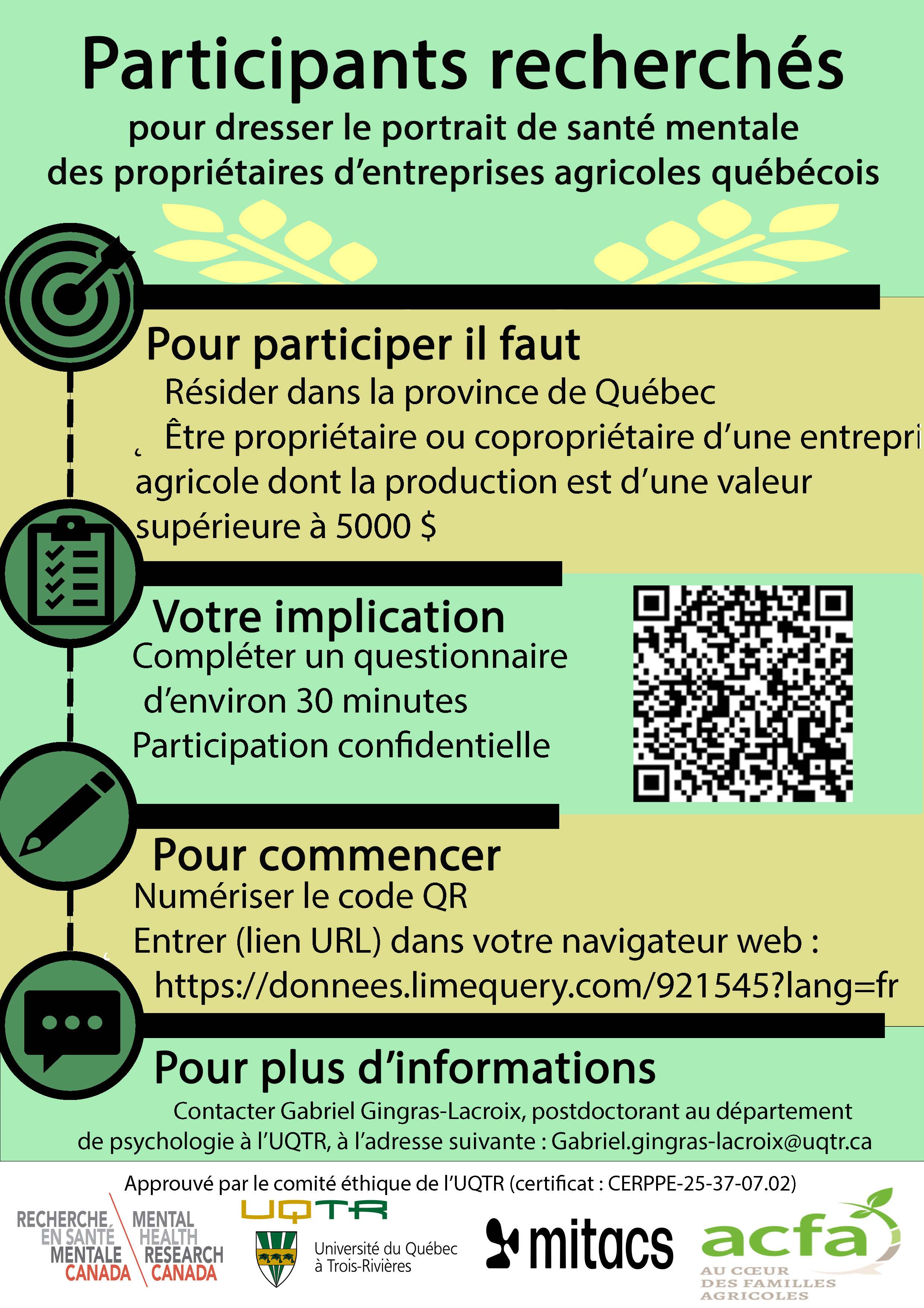 Afin d’avoir un portait plus actuel de la situation, une équipe de recherche de l’Université du Québec à Trois-Rivières a mis sur pied un projet de recherche visant à mettre à jour les données concernant l’état de santé mentale des propriétaires d’entreprises agricoles québécois. À cet effet, si vous êtes propriétaire d’une entreprise agricole, nous vous invitons à remplir un court questionnaire (env. 20 minutes) sur internet. Vous trouverez le lien URL pour participer sur l’affiche qui accompagne ce texte.