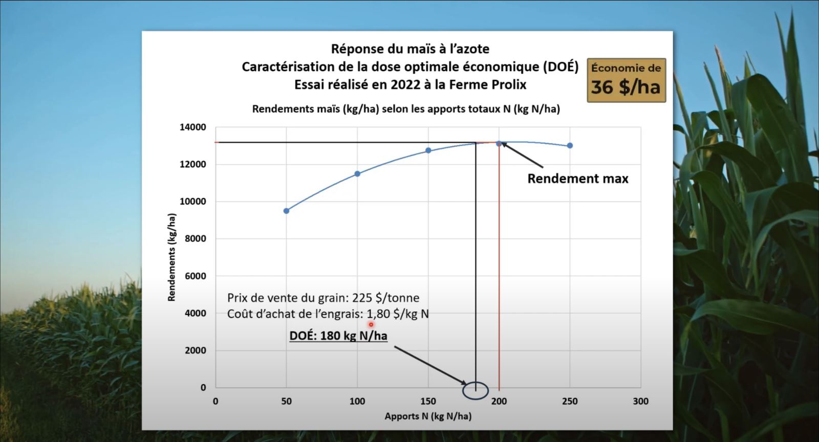 Comme l’explique Guillaume Alix, l’optimisation de la fertilisation azotée est complexe, mais incontournable : trop d’azote signifie un gaspillage d’argent, car la plante ne pourra pas utiliser tout le fertilisant, mais aussi une pollution dans le système hydrologique. La solution adoptée à la ferme Prolix fut d'effectuer des essais au champ sur plusieurs années, en association avec des outils technologiques : un système GPS et un applicateur à taux variable. Avec Gabriel Deslauriers (Groupe Pleine-Terre), M. Alix a observé le lien entre rendements et dose d’azote fournie sur plusieurs années. Ces données ont servi à cibler la dose optimale économique (DOÉ), champ par champ. Dans une rotation avec des cultures céréalières, des pois et un engrais vert, la ferme a réussi une économie de 30 à 50 kg d’azote par an.
