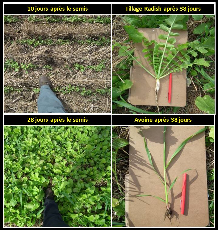 Dans un mélange de cultures de couvertures semé dans le Pontiac cet automne sous semis direct, le recouvrement du sol est passé de 30 à 95 % (gauche) et la racine du Tillage Radish a cru de 10 cm en l’espace de 4 semaines.