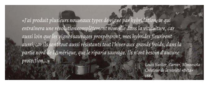 Vers 1870, au Minnesota, Louis Suelter, un immigré allemand, créa, par hybridation, un autre cépage qui restera dans l’Histoire de la viticulture: le Bêta; résultant du croisement entre le Concord de Bull et la vigne sauvage Vitis Riparia que l’on trouvait à Carver County dans le Minnesota. Le Bêta, sera alors largement implanté dans le Minnesota au début du 20ième siècle et fera plus tard office de cépage de base pour de nombreuses hybridations réalisées par l’université du Minnesota. Cette variété est plus rustique et plus hâtive que le Concord, ce qui permet de la cultiver dans des régions plus nordiques.