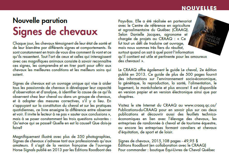 Article "Nouvelle parution Signes de chevaux" dans le magazine Équi-Libre, édition Hiver 2015, de Cheval Québec