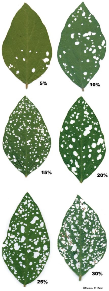 Afin d’estimer le pourcentage de défoliation d’un champ de soya, prélever, dans 10 zones du champ, de 1 à 3 feuilles trifoliées dans le milieu du feuillage de 5 plants (au total, au moins 50 feuilles seront prélevées). Les 10 zones doivent être bien réparties dans le champ, parce qu'il est normal de voir plus de dommages en bordure de champ. Pour chaque feuille examinée, jeter la foliole la moins endommagée et la foliole la plus endommagée. Comparer la foliole restante au montage photographique ci-dessous et déterminer le pourcentage de défoliation. Finalement, faire la moyenne de toutes les folioles retenues. Pour en savoir davantage sur les autres insectes défoliateurs du soya, la façon d’évaluer le pourcentage de défoliation et les seuils d’intervention en fonction du stade de la culture, consultez le bulletin d'information Défoliation du soya par divers ravageurs : méloé cendré, criquets, scarabée japonais, altises, limaces, etc.
