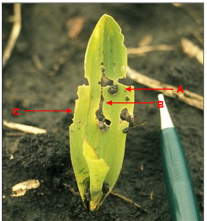 Sur les jeunes plantules de maïs, il est possible d’observer des grignotements, soit des trous de petite taille (quelques mm seulement), qui sont causés par les larves au cours de leurs premiers stades de développement. Plus tard, les larves peuvent aussi s’attaquer au pourtour des feuilles. Finalement, à partir du 4e stade larvaire, le ver-gris noir peut sectionner les plants à leur base.