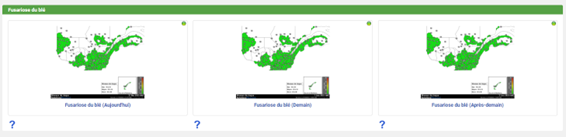 Le site donne accès à des cartes de niveaux de risque pour la journée en cours, le lendemain et le surlendemain. La vérification du niveau de risque permet d’éviter le recours à un traitement fongicide de répression de la fusariose si le risque est faible. Idéalement, vérifier fréquemment les risques sur quelques jours, afin de mieux planifier les interventions avec un fongicide, s’il y a lieu.