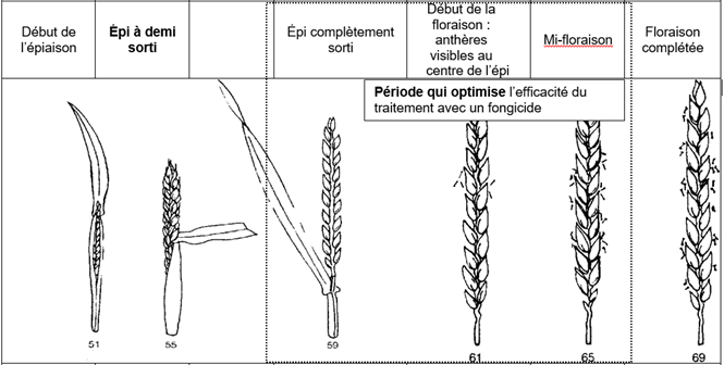 Pour assurer l’efficacité d’une application de fongicide, le traitement doit être réalisé avant la mi-floraison. Plus de 70 % des épis doivent se situer entre le stade début floraison (début de la sortie des anthères) et le stade mi-floraison (50 % des anthères sont sorties; voir le schéma ci-dessous). L’application du fongicide doit donc être faite en minimisant la proportion des épis dont la floraison est complétée. Rappelons que la période d’intervention avec un fongicide est très courte et que suivre aussi les conditions météorologiques permet d’intervenir au moment et dans des conditions qui favoriseront l’efficacité du traitement.