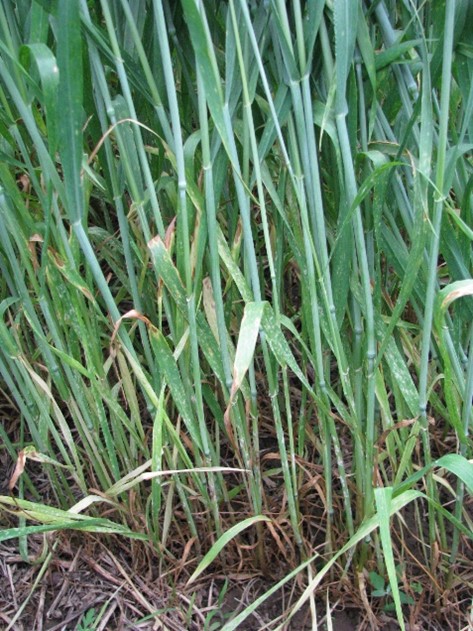 L’oïdium (le blanc) a été observé dans quelques champs. Les cas rapportés touchent le blé d’automne en montaison et les symptômes étaient présents sur les feuilles du bas des plants et sur la tige. La maladie se caractérise généralement par l’apparition de conidies blanc grisâtre (photo ci-dessous) sur toutes les surfaces de la plante, mais le mycélium qui se développe sur la surface supérieure des feuilles est plus apparent sur les feuilles du bas.