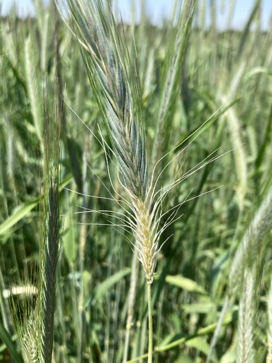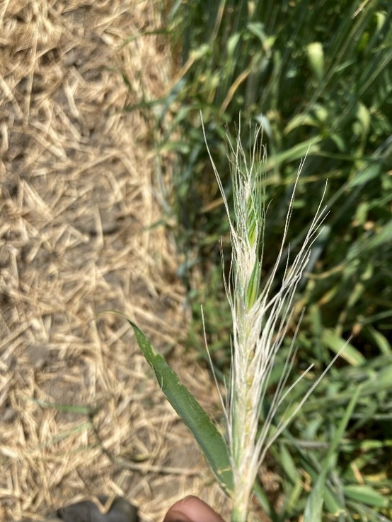 Le gel a endommagé une culture de seigle d’automne à Saint-Bruno-de-Montarville à la mi-mai. Les dommages ont été observés dans une zone de terres basses. Le gel a causé des dommages aux épis en formation. Il s’agit, dans ce cas-ci, d’une culture de seigle à pollinisation ouverte destinée à être rabattue comme paillis. Les photos suivantes (Photos 2 et 3) montrent des symptômes typiques de dessèchement, affectant une partie ou presque tout l’épi.