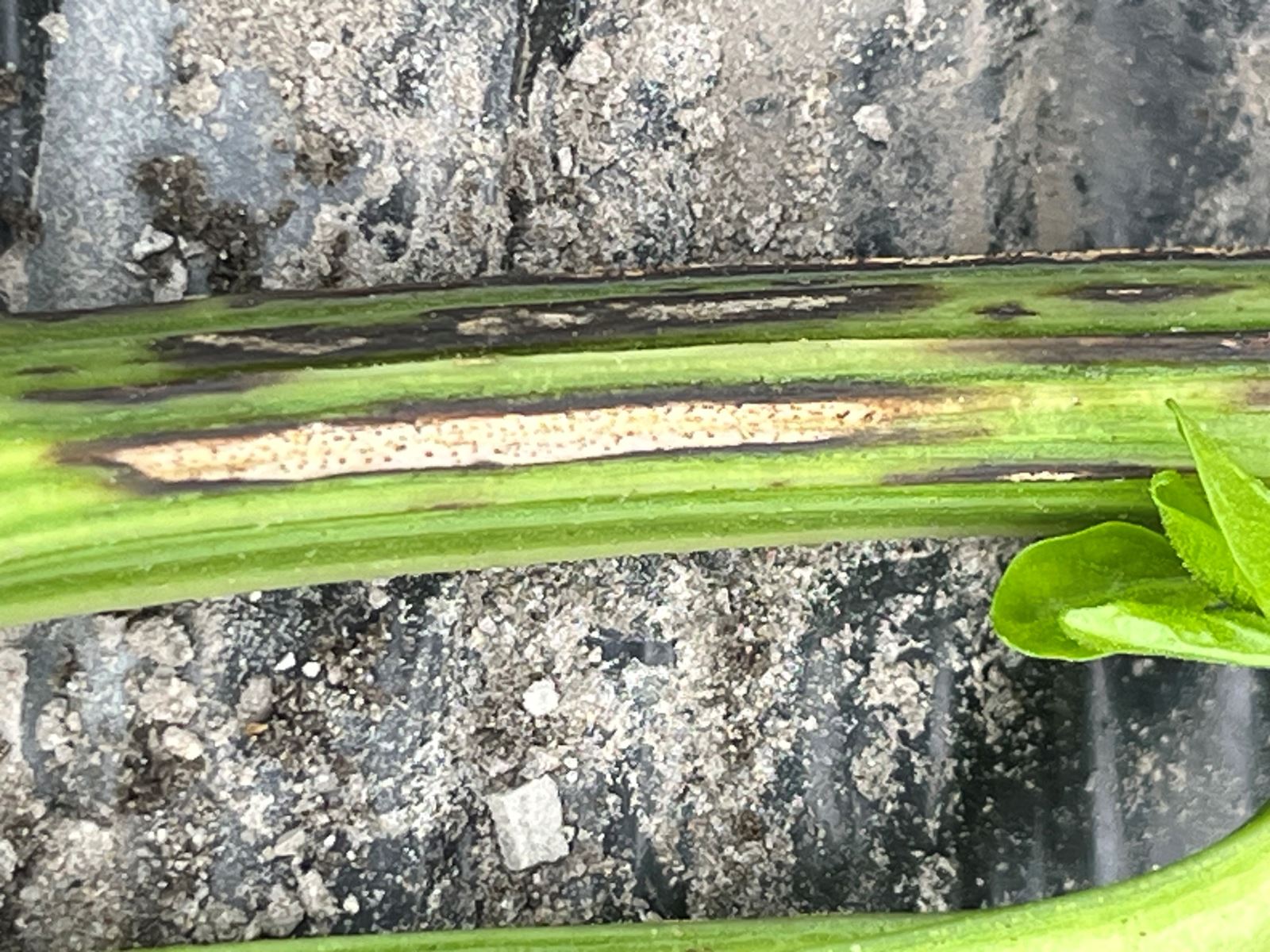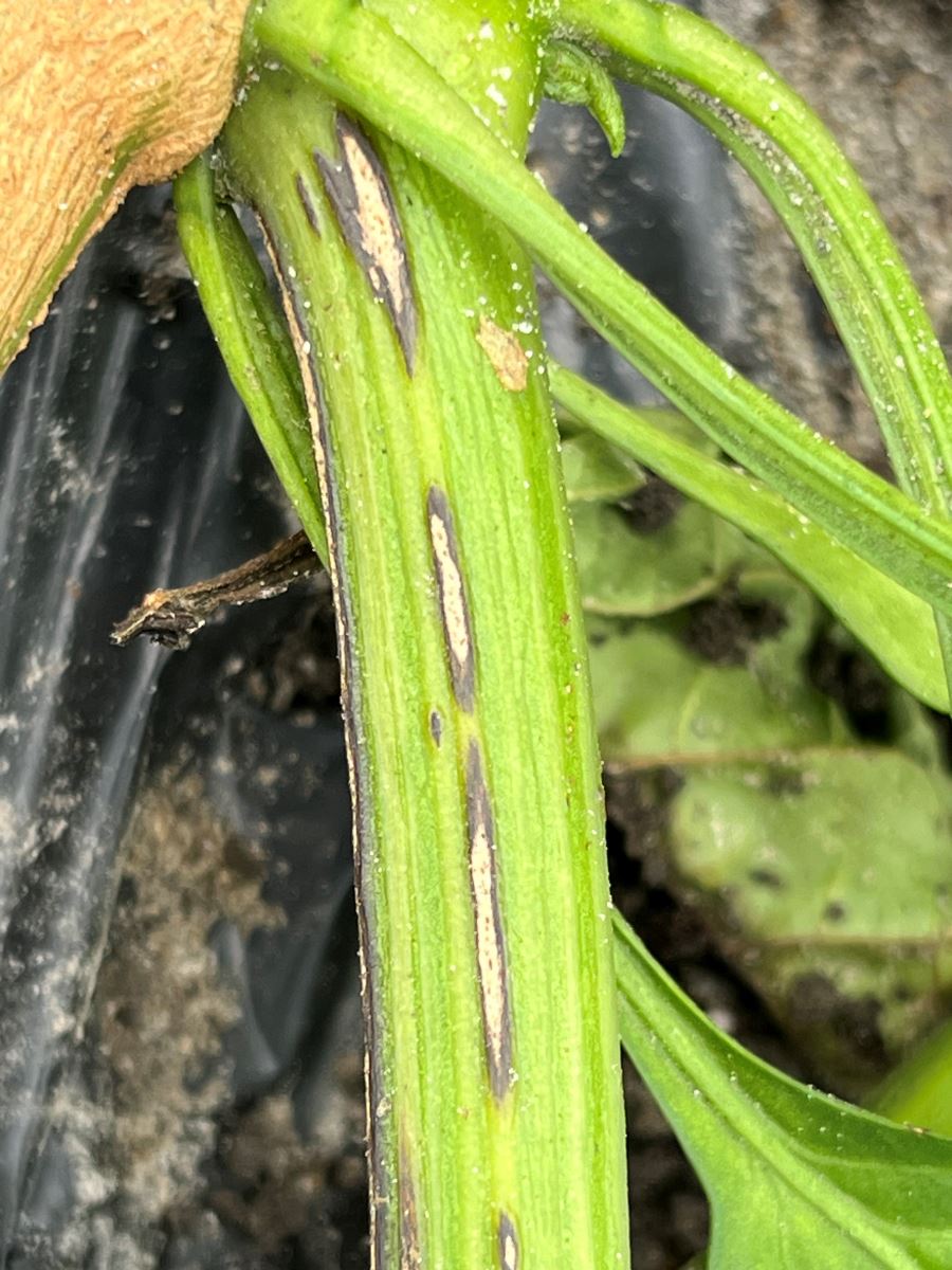 Lésions sur des tiges de poivrons dues à l'anthrachnose