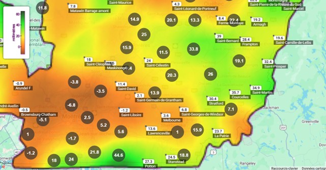Le mois d’avril a été plus pluvieux que la normale dans plusieurs secteurs des régions de l’Estrie et de la Chaudière-Appalaches. La carte suivante montre l’écart des précipitations par rapport à la normale saisonnière pour le mois d’avril. Par exemple, à Stanstead, il est tombé 24,5 mm de plus que le cumul normal pour le mois.