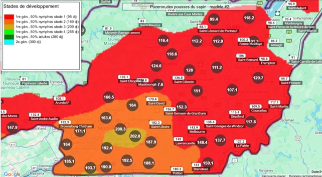Pour faire des dommages aux pousses des arbres, les pucerons doivent atteindre le stade adulte avant d’être prêts à engendrer la 2e génération, et les bourgeons doivent être au moins au stade III (aiguilles exposées, mais non étalées). En ce moment, la majorité des bourgeons des arbres a été vue au stade I dans les régions de la Montérégie, de l'Estrie, de la Mauricie et de la Chaudière-Appalaches.
