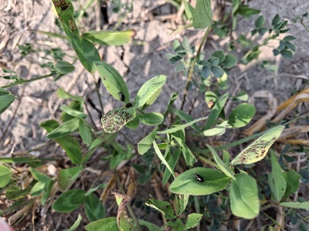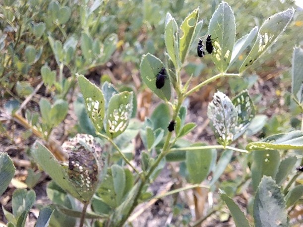 Des signalements de dommages d’altise à tête rouge dans le trèfle rouge et la luzerne ont été rapportés en Montérégie-Est. Il s’agit d’un champ de prairie en implantation et les dommages ont été constatés dans la semaine du 8 août, environ un mois après la première coupe. La hauteur des plants était autour de 15 cm. L’insecte a également été observé dans d’autres champs, mais sans dommages considérables.