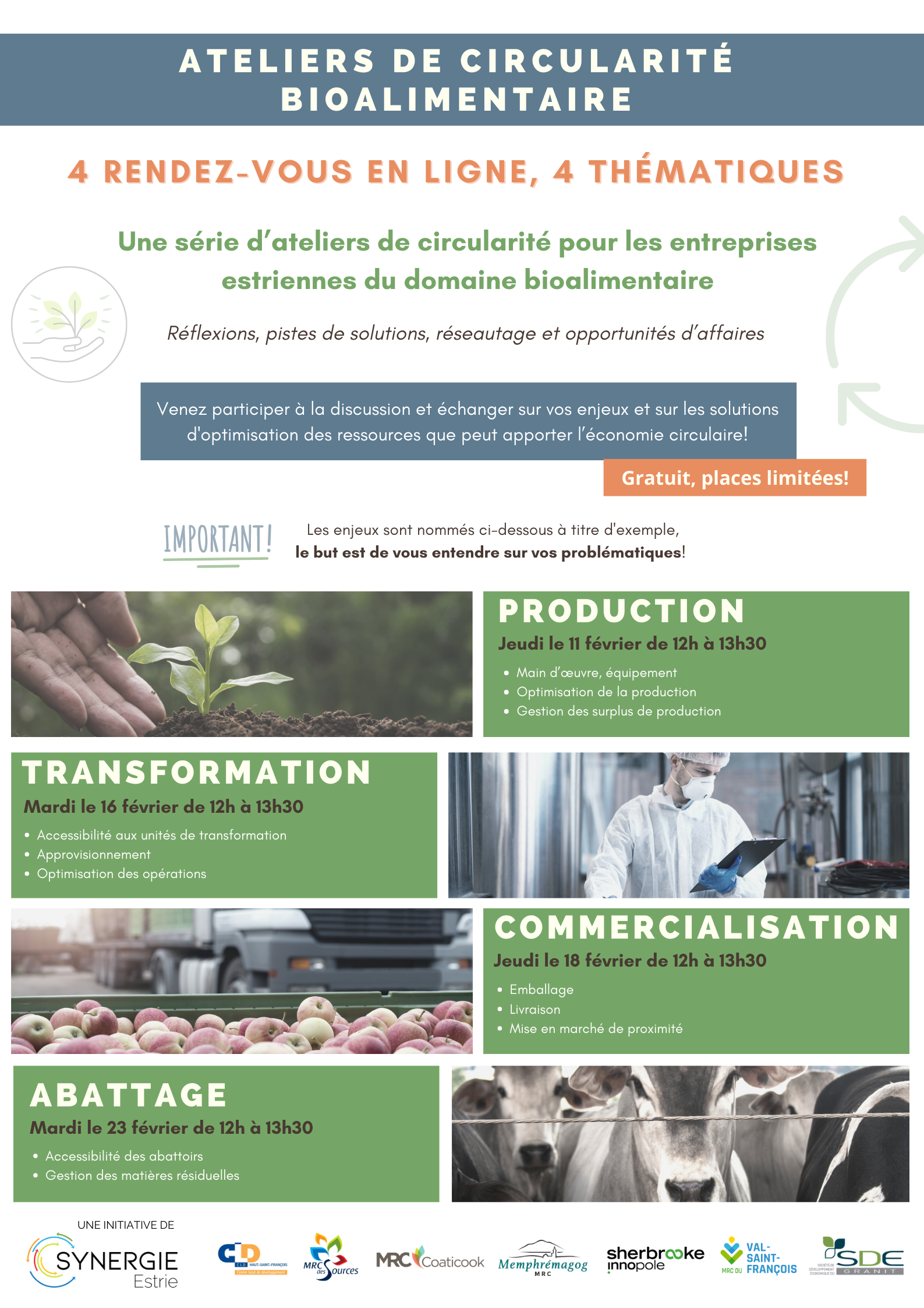 En 2020, les 7 territoires estriens se sont regroupés pour porter le projet Synergie Estrie, une démarche qui vise notamment à favoriser le développement économique de la région. Dans le cadre de nos activités, une série d’ateliers sur le secteur bioalimentaire est organisée au cours du mois de février. Les objectifs de ces rendez-vous virtuels sont de rassembler les acteurs du milieu, d’identifier les enjeux et les problématiques du milieu et d’explorer des solutions potentielles inspirées de l’économie circulaire.