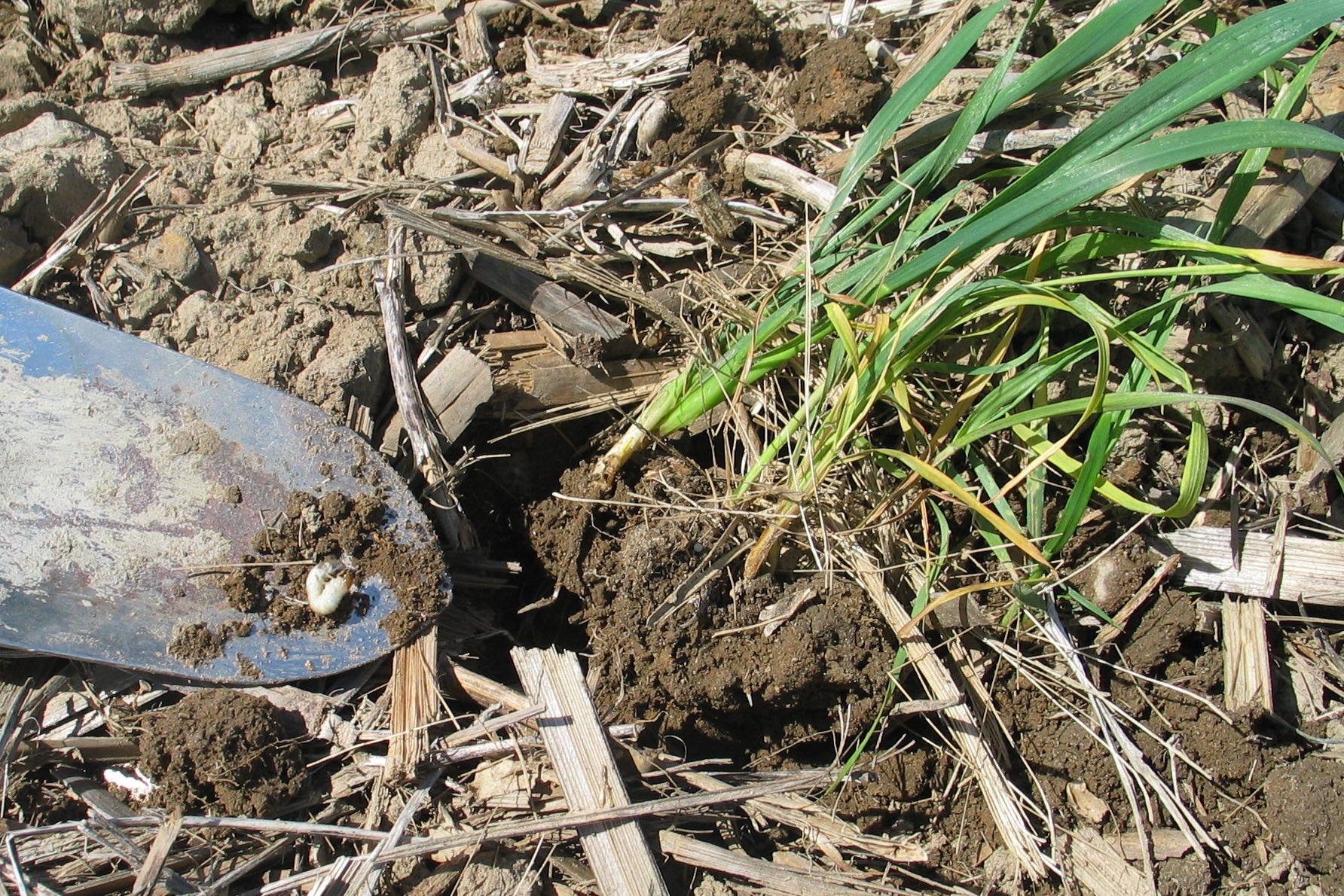 Pour dépister les vers blancs, la méthode n’est pas bien compliquée. Sortez votre pelle à jardin et creusez au moins 5 trous (environ 30 cm de diamètre et 10 cm de profondeur) par champ. Il est recommandé d’intervenir si vous trouvez au moins 5 larves par trou. Si des zones du champ sont visiblement très affectées, concentrez d’abord le dépistage à la bordure de ces zones où les larves seront plus actives.