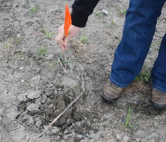 - Déposer l’appât dans le fond du trou, le couvrir d’une petite butte de terre (sans trop tasser le sol) et l’identifier avec un drapeau.