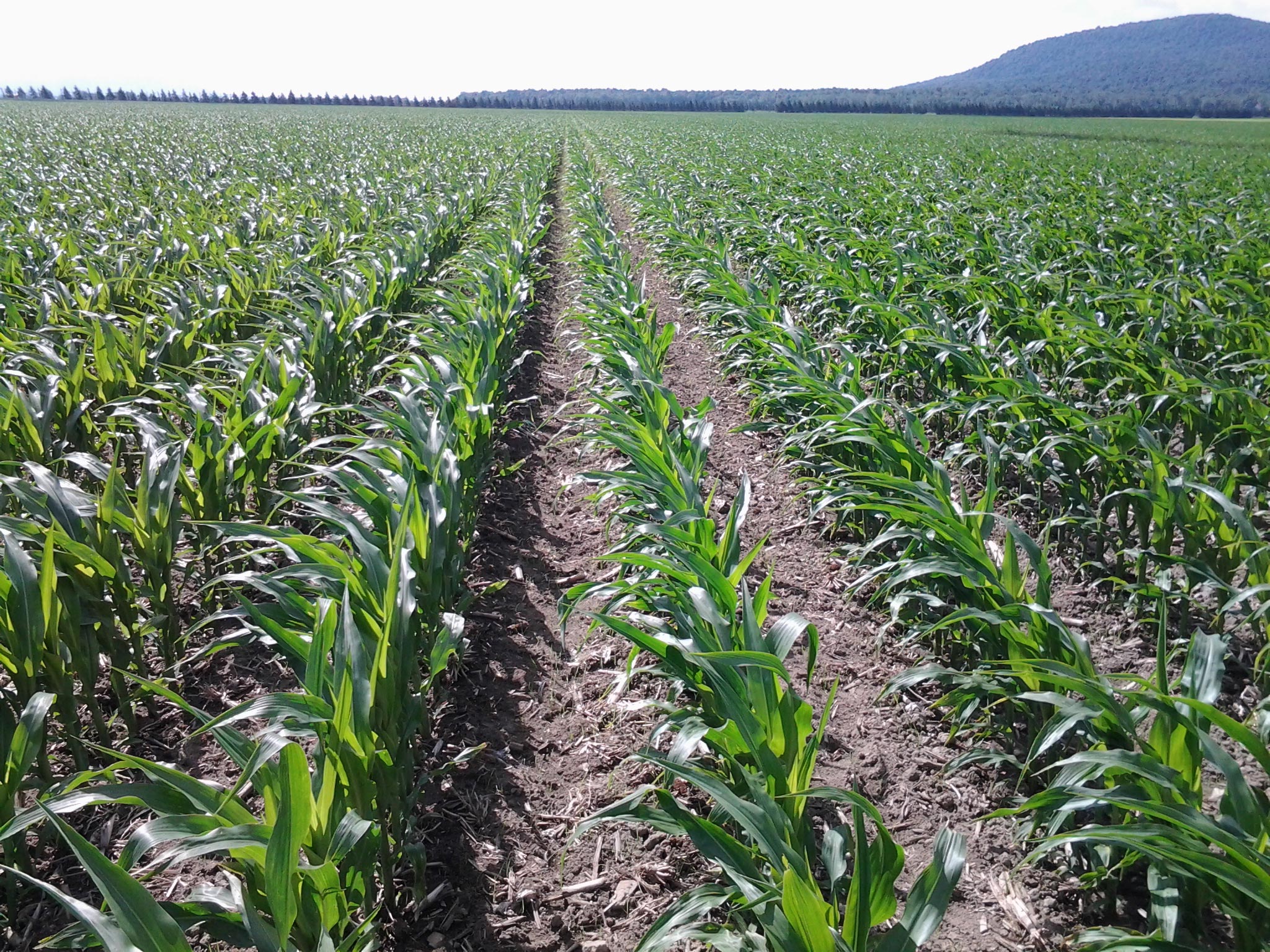Cette parcelle n’a reçu comme toute fertilisation qu’un engrais de démarrage granulaire (40 kg N/ha). Au stade V8, soit au début de la période d’absorption d’azote, elle ne démontre encore aucun signe de carence. Plus tôt (V6), on avait mesuré 19,5 ppm de nitrates, soit un peu en-deçà du seuil de réponse (25 ppm).