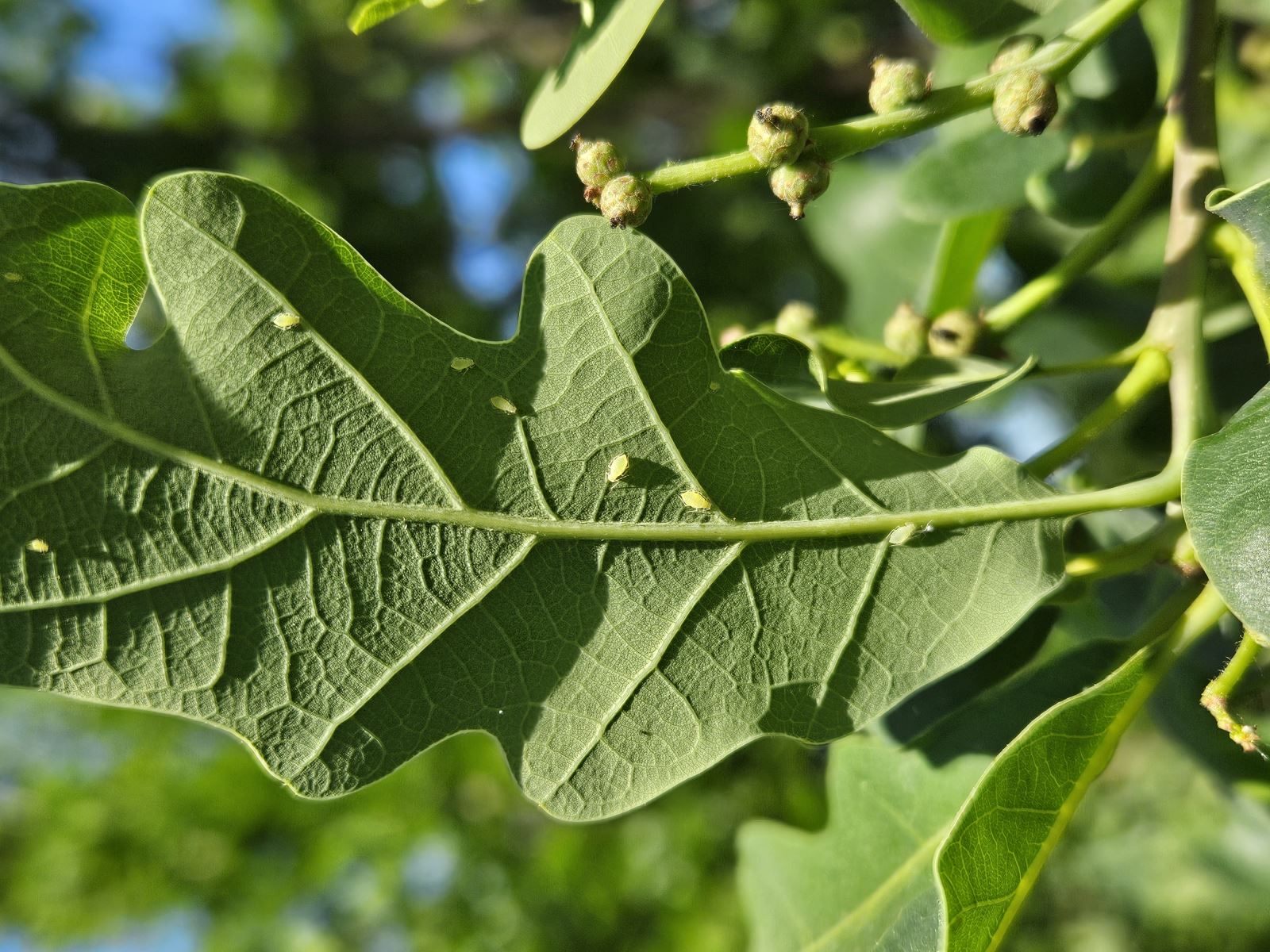 Le 22 mai dernier, il a été question de la présence de pucerons dans divers arbustes. Différentes espèces de pucerons affectent maintenant aussi des plantes vivaces dont les Hemerocallis sp. Des arbres comme le tilleul, l’orme et le chêne sont aussi infestés par des pucerons (ex : phylloxère du chêne, puceron lanigère de l’orme). Du miellat est visible sur les plants.