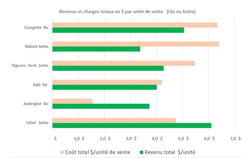 Les possibilités d’étaler la période de récolte en maraîchage et d’élargir son offre sont donc prometteuses, mais qu’en est-il de la rentabilité? Avec les données actuelles, les calculs démontrent que l’aubergine et le céleri arrivent à être profitables : ils combinent un bon potentiel de prix de vente et un bon potentiel de rendement. Toutefois, le kale, la courgette, les oignons verts, dont les coûts d’opérations sont moindres, ont un potentiel de revenu moyen mais ne sont pas encore rentables : c’est le prix de vente constaté qui ne permet pas de dégager de profit.