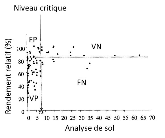Figure 1. Distribution des rendements de part et d’autre du niveau critique d’analyse de sol. VN = vrai négatif (rendement relatif élevé, peu de réponse aux engrais au-delà du niveau critique). FN = faux négatif (rendement relatif faible sans réponse aux engrais au-delà du niveau critique). FP = faux positif (rendement relatif élevé sans réponse aux engrais mais sous le niveau critique). VP = vrai positif (rendement relatif faible sous le niveau critique).