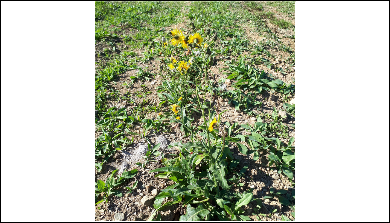 Tout d’abord, il est primordial de connaitre son ennemi, en l’occurrence, le laiteron des champs (Sonchus arvensis L.). Le laiteron est une vivace à enracinement profond, un peu comme le chardon des champs, de là réside tout le défi pour le contrôler. Il se répand très rapidement par son système racinaire en formant des « talles » dans le champ qui s’élargissent avec le temps. Ses racines verticales sont profondes (jusqu’à plus de deux mètres) et ses rhizomes horizontaux se retrouvent généralement à une profondeur se situant entre 5 et 20 cm (moins profond que le chardon). Sur ces rhizomes horizontaux, aussi appelés racines rampantes ou traçantes, se trouvent de très nombreux bourgeons d’où repartent les tiges qui ressortiront du sol. Selon les conditions de croissance et le phénotype, la hauteur des plants matures varie entre 30 cm et 2 m. La floraison survient de juin à octobre et le délai entre la floraison et la maturité des graines est d’environ dix jours. Sachant qu’un plant peut produire jusqu’à 10 000 graines et que celles-ci sont transportées par le vent grâce à leur plumet (tout comme le pissenlit), on comprend la nécessité d’agir en prévention et rapidement. Voilà des informations fort pertinentes afin d’établir notre stratégie de contrôle.