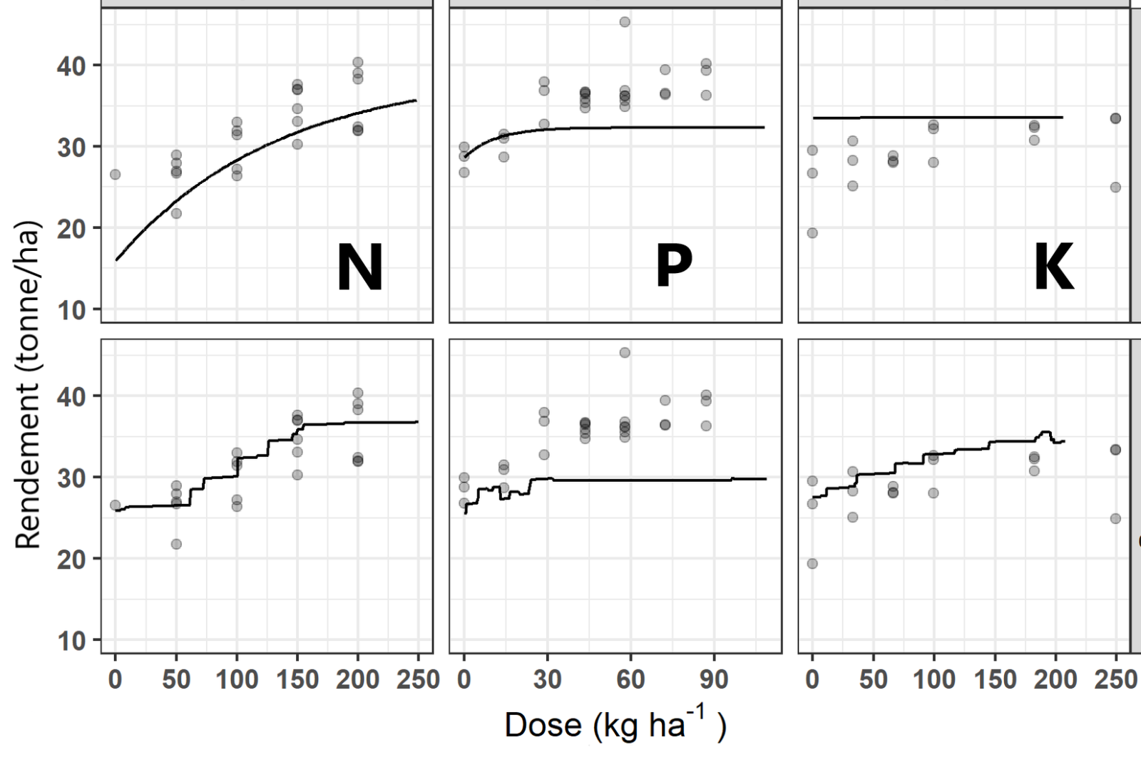 L’efficacité d’utilisation des engrais est déduite du modèle comme la pente de la courbe de réponse (?rendement/?dose). Souvent élevée initialement dû à la forte pente initiale de la courbe de réponse jusqu’à une certaine dose, l’efficacité d’utilisation des engrais s’atténue avec l’augmentation de la dose jusqu’à devenir nulle ou même négative à forte dose. Le risque environnemental évolue dans le sens inverse car l’efficacité d’utilisation de l’engrais diminuent avec la dose : une plus faible proportion de l’engrais étant récupérée par la plante malgré un rendement plus élevé et une plus forte proportion étant déposée dans l’environnement. Une dose économique optimale est un compromis entre un rendement élevé, une haute efficacité d’utilisation de l’engrais et un impact environnemental faible.