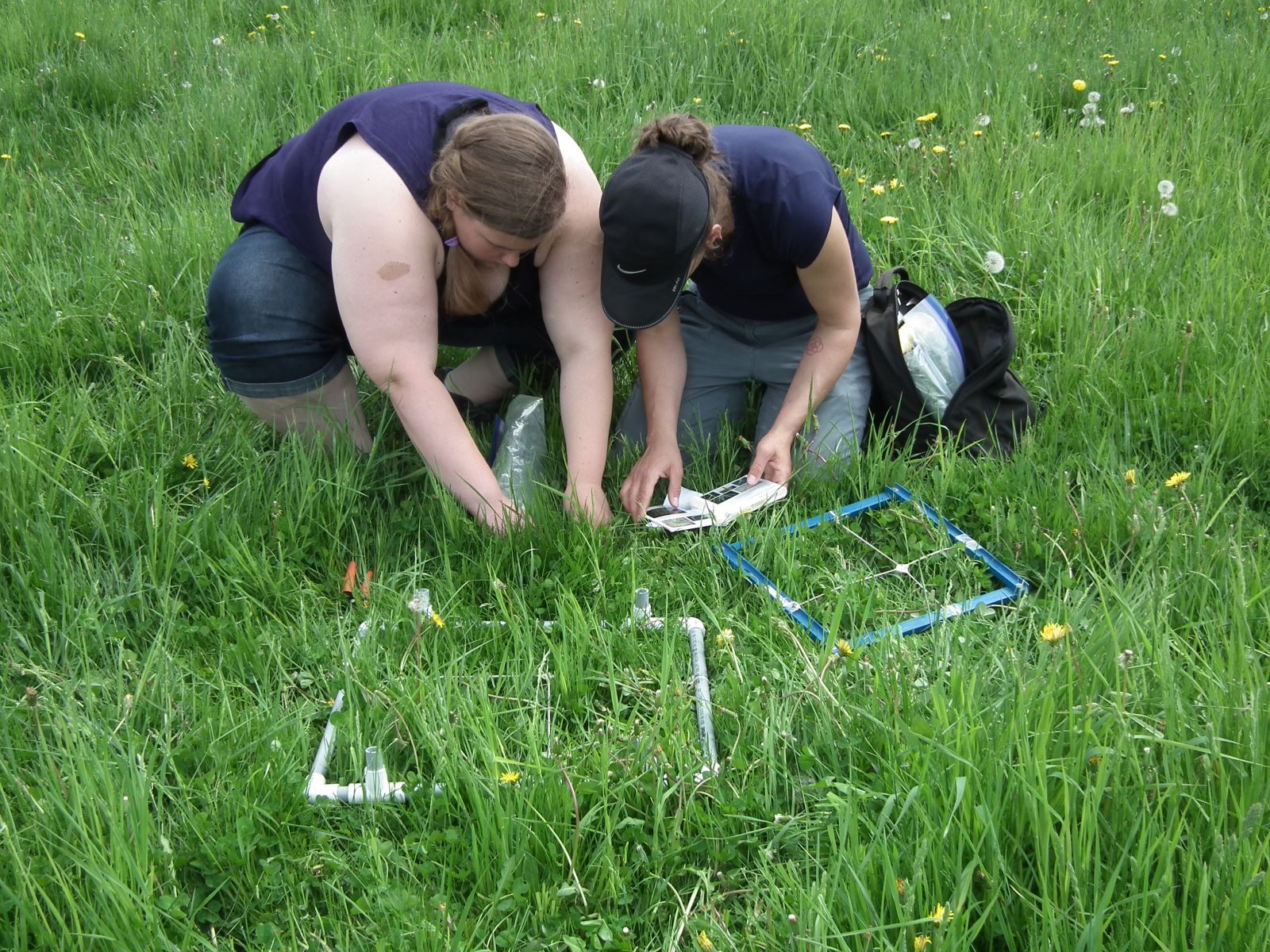 Maryse Vallières-Murray, étudiante en génie agroenvironnemental (gauche), et Christine Rieux, agronome (droite), évaluent le rendement et la composition des pâturages soumis à diverses cures de rajeunissement à Bristol dans le Pontiac. (Crédit photo : Mavis Thompson)