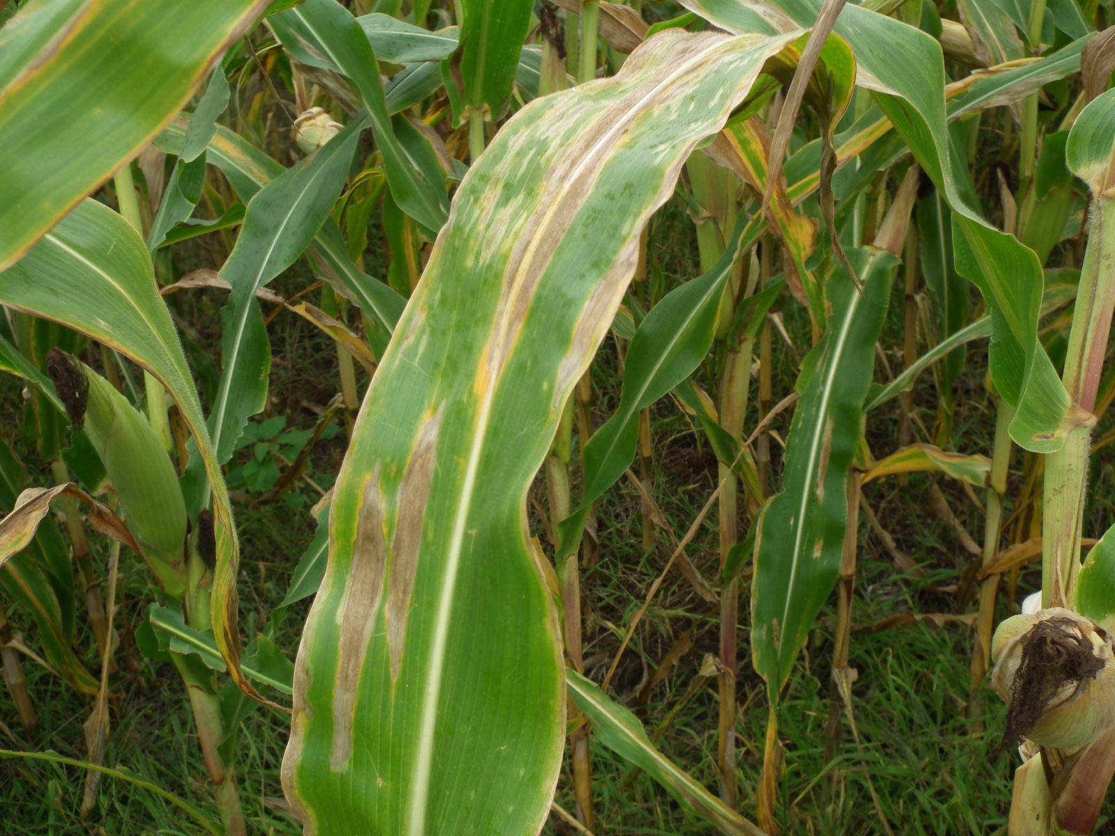 La maladie apparaît après la floraison et ne touche que les feuilles. Elle est caractérisée par des taches ou lésions elliptiques vert grisâtre qui mesurent entre 2 et 15 cm de long. Les taches se regroupent pour former de grandes plages d’aspect brûlé au fur et à mesure que la maladie progresse. Dans certains cas, les feuilles apparaissent complètement desséchées. Des zones noires sont parfois visibles sur les taches lorsque le champignon produit des spores. Les vieilles feuilles sont les plus affectées, mais la maladie peut atteindre tous les niveaux de feuille.