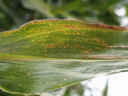 Feuilles et tiges : présence de minuscules taches décolorées se transformant progressivement en pustules brun rougeâtre, rondes à elliptiques, et devenant noires avec la maturité de la culture. Elles sont disposées en ligne sur les feuilles lorsque l’infection se produit au stade verticille (cornet). Les pustules sont présentes sur les faces supérieure et inférieure des feuilles. Les pustules finissent par éclater, laissant apparaître une masse poudreuse brun rougeâtre. Les jeunes feuilles sont les plus sensibles. Dans les cas graves, les tissus autour des pustules jaunissent, sèchent puis meurent.