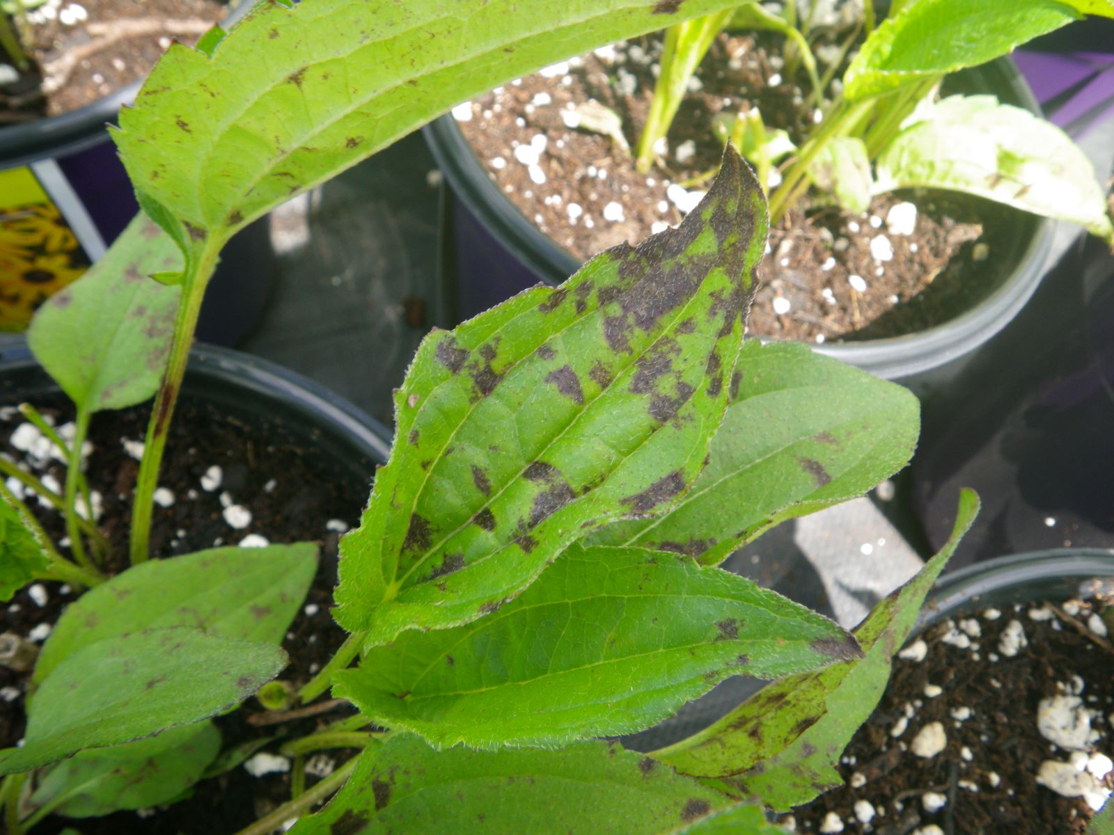 Le mildiou du tournesol a été observé dans des cultures de rudbeckies dans les régions de Lanaudière et des Laurentides. La face supérieure présente d’abord une tache vert pâle avant de noircir progressivement. Éviter d’irriguer par aspersion, surtout quand la température se situe entre 15 et 22 °C. Aucun fongicide n’est homologué spécifiquement contre cette maladie.
