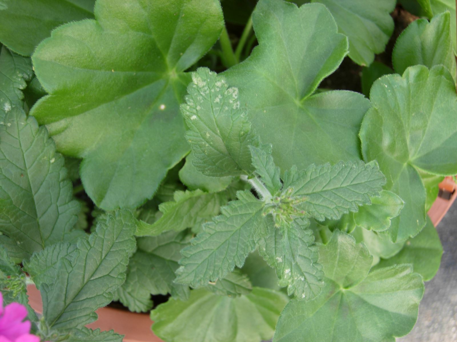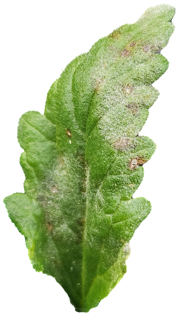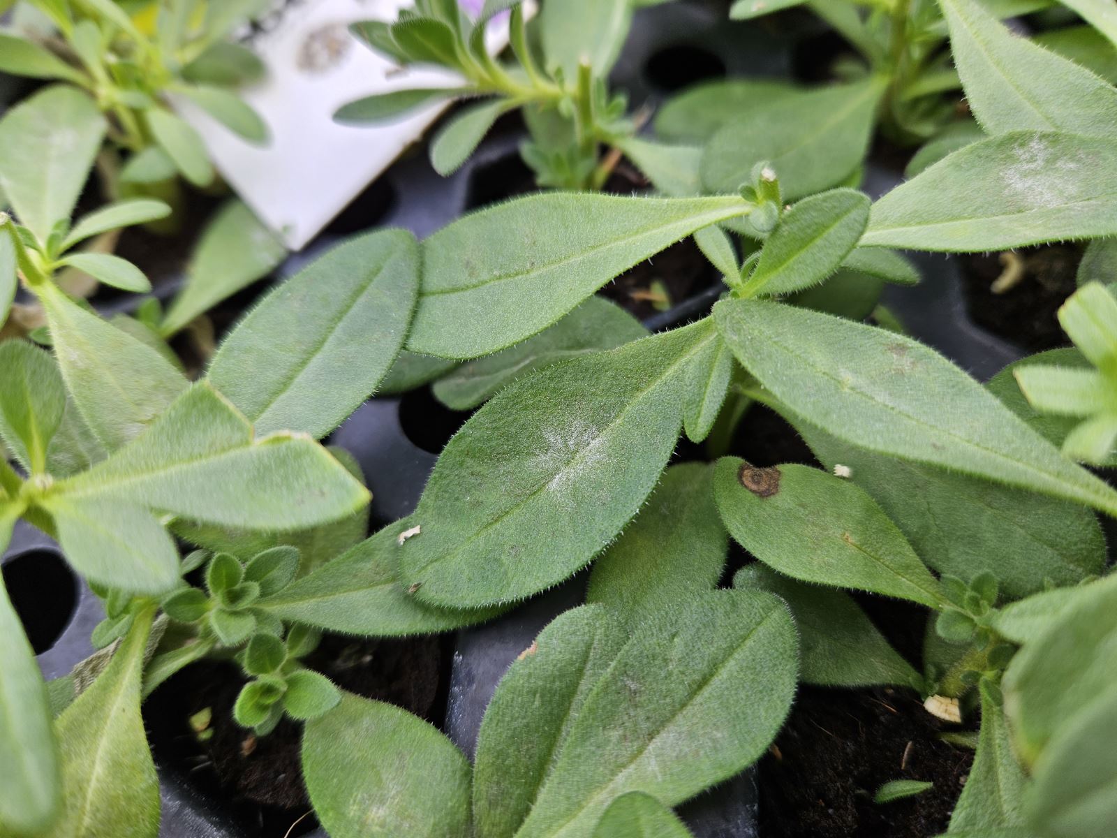 Blanc : La présence importante de taches foliaires d’oïdium (blanc) a été rapportée dans des boutures de certaines variétés de Verbena. Un début d’infestation a aussi été vu dans des jeunes plants de Calibrachoa sp. et de Dahlia sp. livrés récemment.