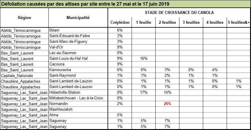 Les pourcentages de défoliation par les altises dans les sites suivis par le RAP Grandes cultures sont généralement faibles. Cependant, un site au Saguenay–Lac-Saint-Jean (à Normandin) présente un niveau de défoliation supérieur au seuil d’alerte de 25 % (voir le tableau ci-dessous). Deux autres sites présentent des niveaux de défoliation plus élevés, soit à Hébertville-Station (Saguenay–Lac-Saint-Jean) et Saint-Louis-du-Ha! Ha! (Bas-Saint-Laurent). Les pourcentages de défoliation de ces champs sont de 14 % et 16 % respectivement. Puisque les dommages causés par les altises peuvent évoluer très rapidement lorsque les populations sont élevées et que le canola est présentement à un stade vulnérable, nous recommandons de procéder à un dépistage préventif des champs de canola au Saguenay–Lac-Saint-Jean et au Bas-Saint-Laurent.